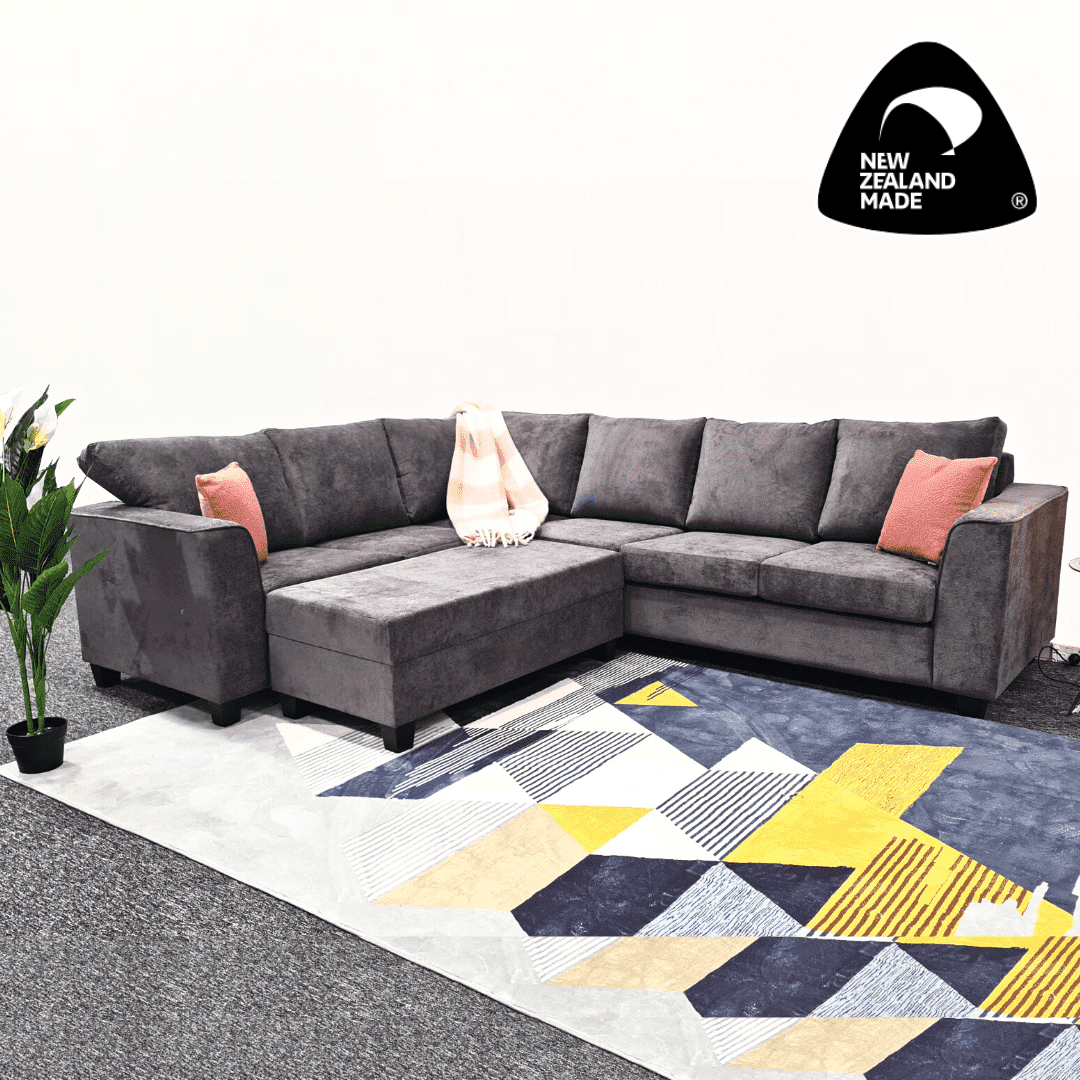 Washington corner lounge suite is a modern sectional lets you to create a right arrangement for your living room. It comes with storage ottoman. This sectional lounge suite is proudly made in New Zealand. The cushion back and square arms give it an invitingly modern and stylish look. Customize it to your space with its modular design.
